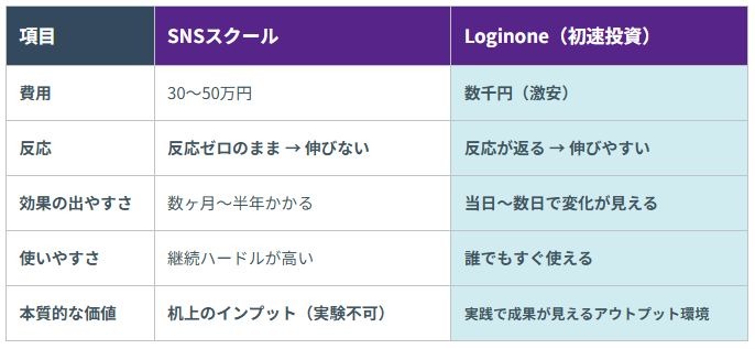 スクールが意味ないわけではない。ただし順番が違う。今はLoginoneがオープン記念で激安。スクールに30万払う前に、まずは初速を作れ。それが唯一、最短で成果に向かう方法だ。